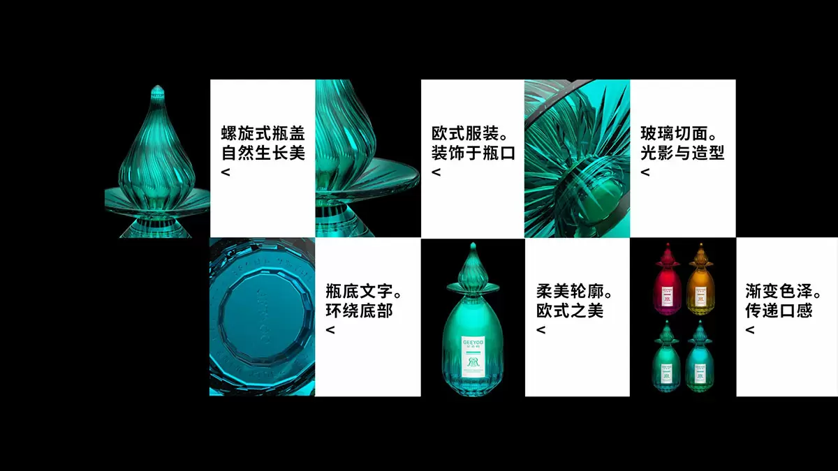 这是一款来自欧洲的果酒。该品种起源于意大利地中海气候,由当地人用传统手工制作,由于酒精含量低,深受女性消费者欢迎。卖点是喝下剩下的牙齿,为消费者创造身临其境的果酒体验。为此,我们将最大限度地发挥“欧洲葡萄酒”的特色。最后,我们用渐变透明玻璃制作了酒瓶,以推断出果味的前调和茶的后调。通过瓶底的16边钻石切割面,表现出了具有留香功能的珍贵果酒。瓶盖通过玻璃工艺演绎成螺旋结构,展现优雅女性身体的柔软美感。加长的瓶口源自欧洲女装,在功能上有利于葡萄酒的倾倒体验。