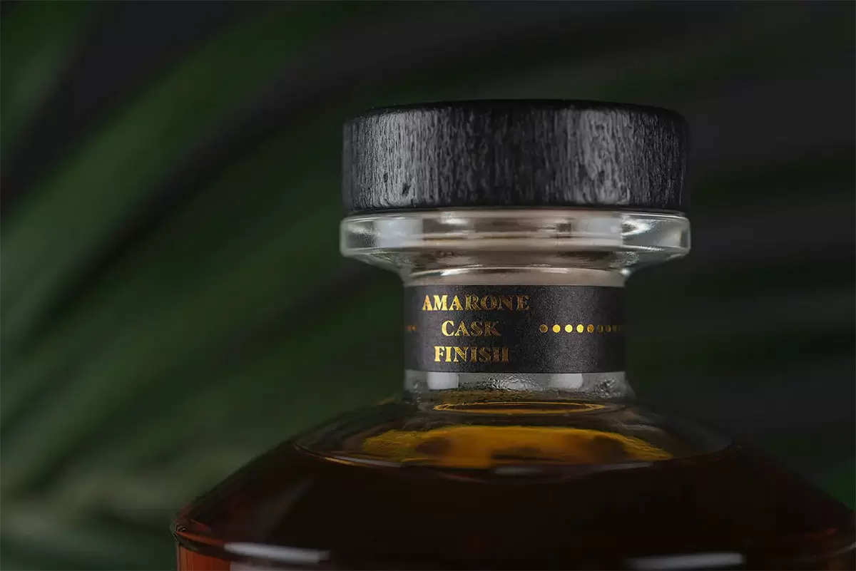 Ron Elección的意大利客户的包装设计。这种朗姆酒在巴巴多斯蒸馏,但在阿玛龙酒桶中陈酿,非常典型的意大利。在简报中,他们告诉我们,他们希望包装能反映朗姆酒的起源,但也非常重要的是,它能反映出这种非常个人化的老化类型。标签由两张不同的纸组成,一张非常热带的拼贴画,上面有典型的巴巴多斯植物和动物,还有纹理白纸上的殖民建筑,上面是一张写有朗姆酒名称和类型的木纸。衣领因其在衰老过程中的清醒而引人注目,黑色木塞将套装闭合,赋予其优雅。