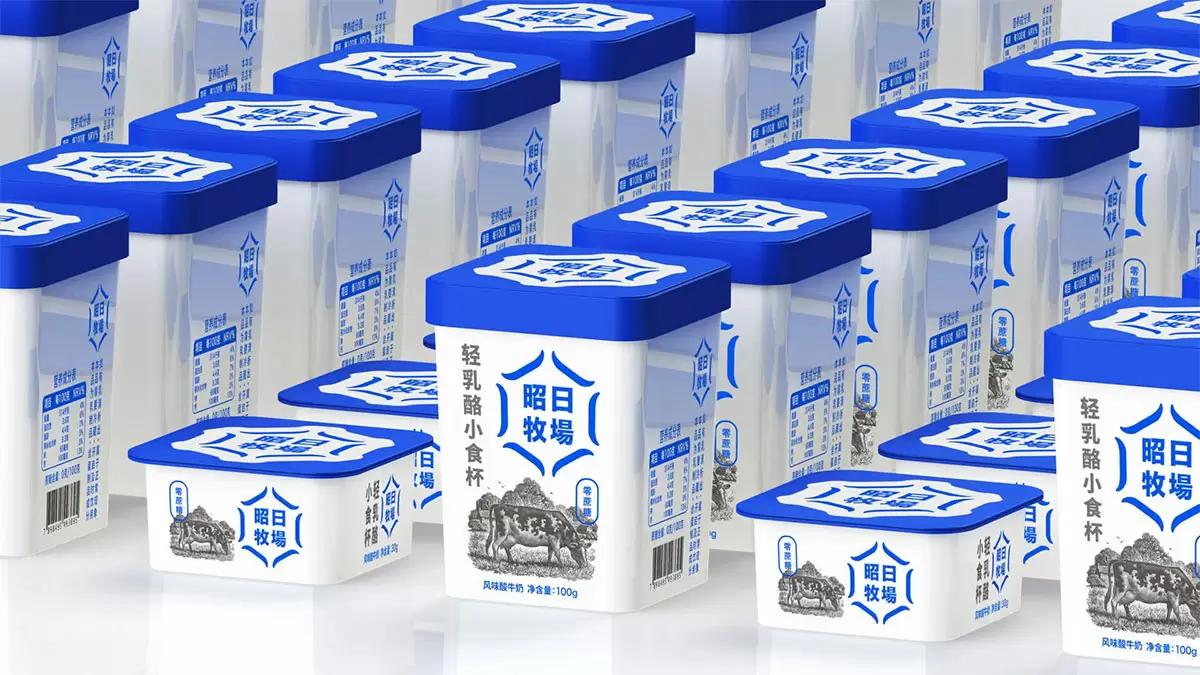 赵日牧场拥有广阔的天然牧场,肥沃的土地上长着嫩草,蓝天白云下免费饲养奶牛,挤出天然健康的牛奶送到消费者手中。如何传达“自然健康”的品牌印象,成为本次设计的重点传播意图。颜色是吸引消费者的一个重要方面,而特别调配的蓝色象征着“奶牛和工艺流程的良好环境”,这为淡奶酪零食杯的质量一层一层背书。昭日牧场作为日本的股份制企业,将日本传承下来的家族徽章融入到品牌平面设计中。六瓣形状为六角,形成最强的六边形矩阵,代表了品牌倡导的优质牛奶的六大元素。在健康维度,零蔗糖图形的加入呼应了“健康”的品牌印象;使用手绘插图描绘赵日牧场的场景,展示“自然”品牌的印象。整体设计优雅简洁,传达高效,为消费者在购买时提供清晰的思维,为传达品牌印象奠定了良好的基础。