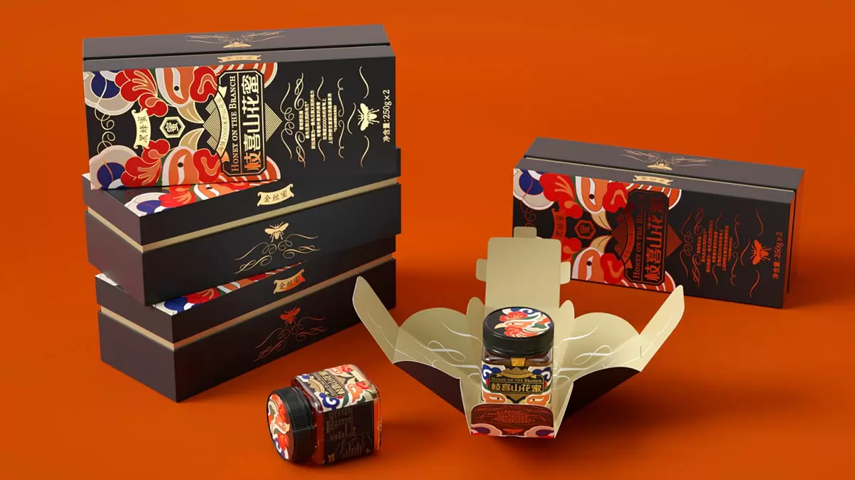 蜂蜜礼盒在市场上销售已有数年之久, 繁琐的礼盒结构常常令人感到物非所值。 枝喜的创作发挥工艺优势, 融入中式特色, 流线型花瓣简洁大方, 一纸成型结构更好的解决了印刷的成本问题, 减少浪费, 同时紧扣“山花蜜”的核心概念, 给予消费者完整、 惊艳的视觉感官体验。要打造中国人熟悉的高级感,需要十分注重装饰效果,从简单到繁杂,从整体到局部,或庄严肃穆、或典雅优美,在每个细节都做到精雕细琢,把一罐好蜜“包装”出价值感。