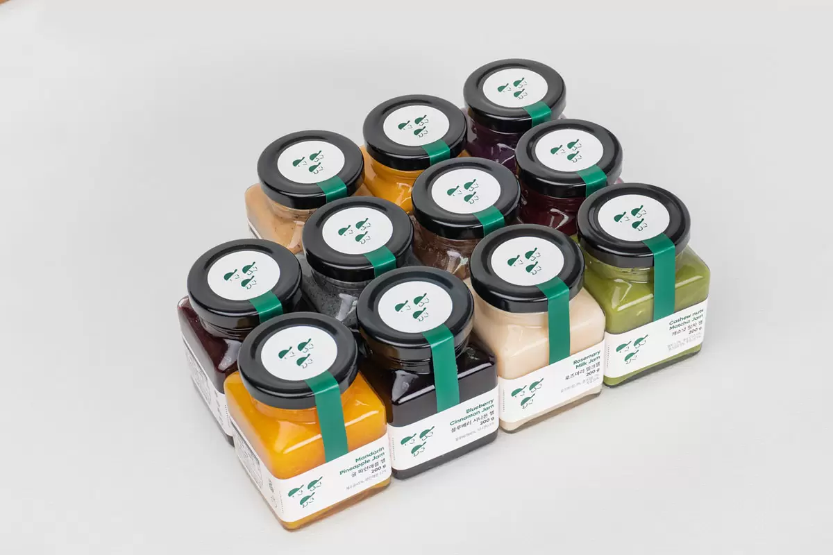用三只勺子的形状和三个小男孩的形象相结合,logo设计风格单纯有趣,表现产品的天然纯粹。包装瓶采用透明瓶子,与品牌的绿色相呼应,整体色彩真实清新,通过视觉强调产品的甜美口感。