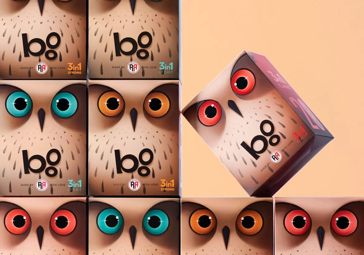 Boo Retail的包装设计相当成功地将猫头鹰形象与品牌相关联,并展现了品牌的创新、活力和个性。这种设计注重品牌识别,能够在竞争激烈的市场中吸引消费者,并传达出品牌的特色和价值。