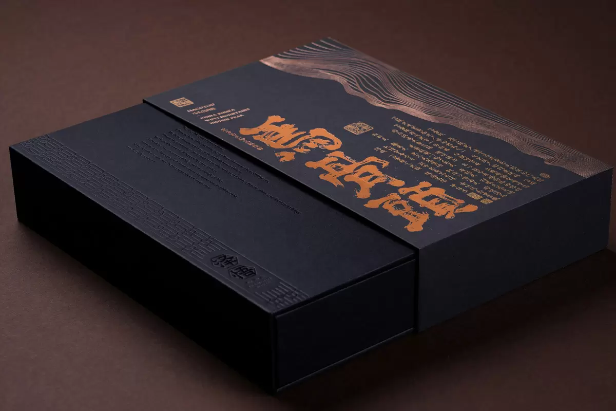 盒型,抽屉封套结合中国古代书型盒,搭配契合的色彩和材质。书法笔触展现产品特质,线条勾勒主图,正面似茶汤入喉的骨感,侧面形似一匹骏马。