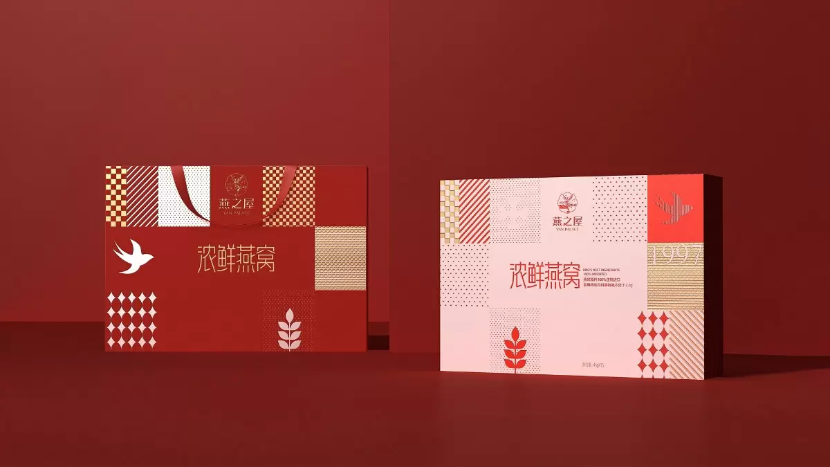 双十一浓鲜燕窝的礼盒设计提取了燕之屋的品牌色红色和金色,以高级生活方式相关的抽象图形,以经典餐桌方格布的方式组合构图配合温柔的配色,营造出“时尚"、“轻快”、“明亮”的产品调性。画面营造出“时尚"、“轻快”、“明亮”的产品调性。烘托柔软、治愈、优雅的情绪。当代女性的轻奢下午茶时光,方格餐桌布,增加食欲感。画面的中的燕子代表着产品属性,1997是燕之屋的成立时间,表达了燕之屋在燕窝领域行业已经深耕了23年。经典的波点,方格是对燕之屋的印象具象化表现,主要是为了烘托氛围感,叶子代表着无添加,纯天然,表达了燕之屋用心做产品的匠心精神。