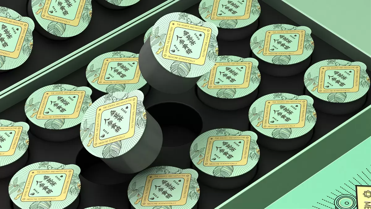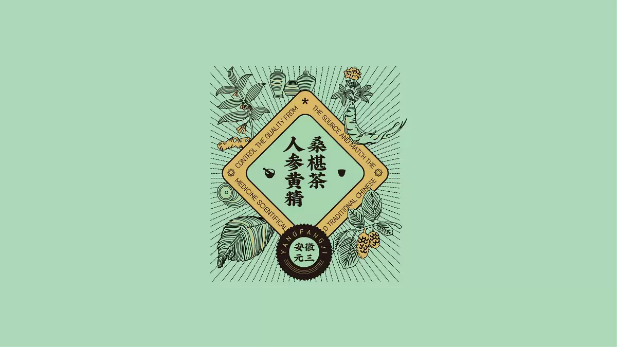 以〝时尚” 〝潮流”作为主要视觉风格,表现“古方植物成分”的传统养生古方形状为基础,融入手绘人参黄精柔葚等手绘植物元素,浅绿色的色彩给人以绿色生态纯植物元素的感觉,局部烫金工艺的运用增强画面整体品质感,黑色的运用暗喻“生发”“养发”的功能特点。