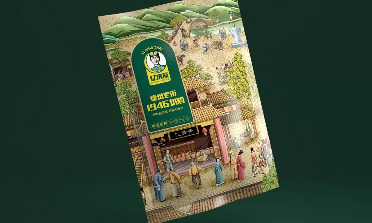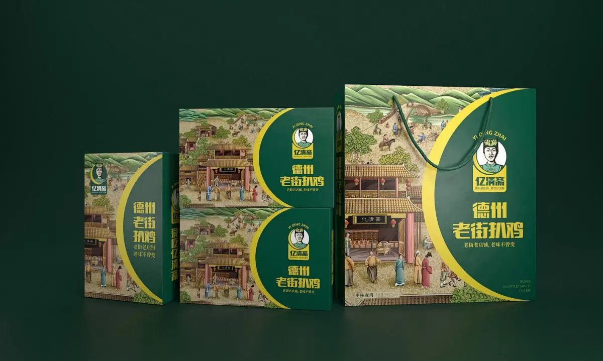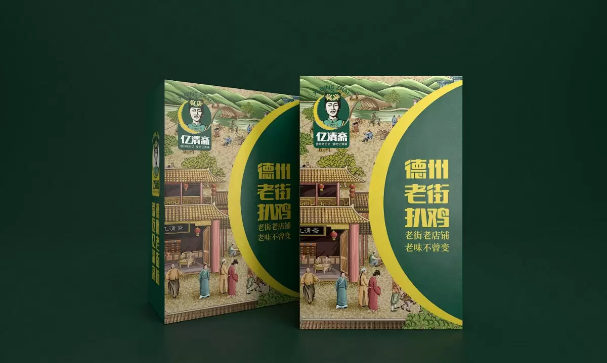 产品定位到山东德州最有名的扒鸡品类,手绘插画以传统的古风感,勾勒老德州的市井风土人情,营造出活泼热闹的美食生活图景,进而呼应品牌“德州老街坊,爱吃亿清斋”的情怀,不同盒型的包装形式呈现一致的插画内容,画面描绘了老百姓、林木山脉等环境,并融入了亿清斋的店铺名,表达品牌悠久历史的同时,增强了产品在消费者心中的故乡情怀,侧标的品牌标识,以身着少数民族服装的女性为主视觉,印刻字体增强感观体验,很好地保护了产品信息的可读性,部分延展设计的竖直排版充分还原了旧时文章的韵味。