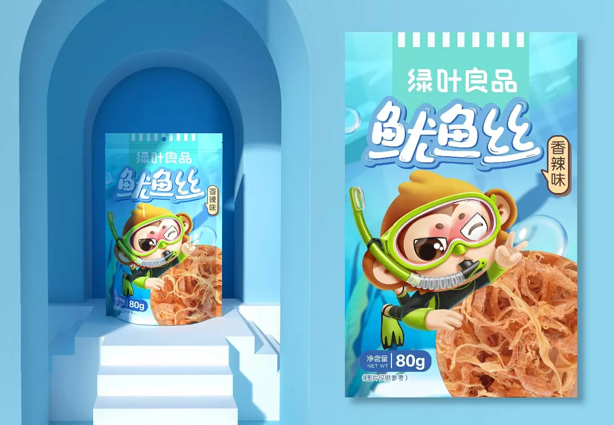 以可爱的猴宝IP形象与海洋食品互动为主题设计,在体现产品的同时为包装带来趣味感,整个色彩、字体、也紧贴产品属性。