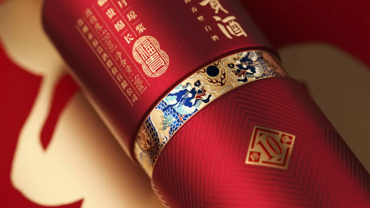 永福贵酒以“岁月琼浆 福贵绵长”为品牌理念,释意福禄和好运能荫及后代而长久的保持下去,如同岁月沉淀的琼浆玉液一样醇厚而悠长。瓶型设计在酱酒经典圆柱瓶型上进行变化,圆柱形在视觉上稳定而优雅,寓意充满包容和和谐的岁月。标志“福贵”将产品名称与传统元素结合,突出品牌的高端感和奢华质感。龙自古以来是福运亨通的吉祥代表,搭配中国传统双龙图腾纹样,突显品牌的独特性和神秘威严的氛围。瓶身腰部凹陷结构设计,烤花彩色龙纹,同样也是象征着荣耀与尊重的“金腰带”。放射状棱形纹理融入酒瓶,释放出极具视觉冲击力的图形之美。在保证持握手感的同时,营造出立体感与现代感。外盒使用硬泡沫材质,中间采用金卡纸裹标装饰,增添品牌的精致和贵气。整体设计原则在于找寻传统与现代时尚的平衡点,以简洁、精致和高雅为原则,旨在展现产品华贵感、典雅感和高品质,体现品牌的独特性和与众不同的特点。