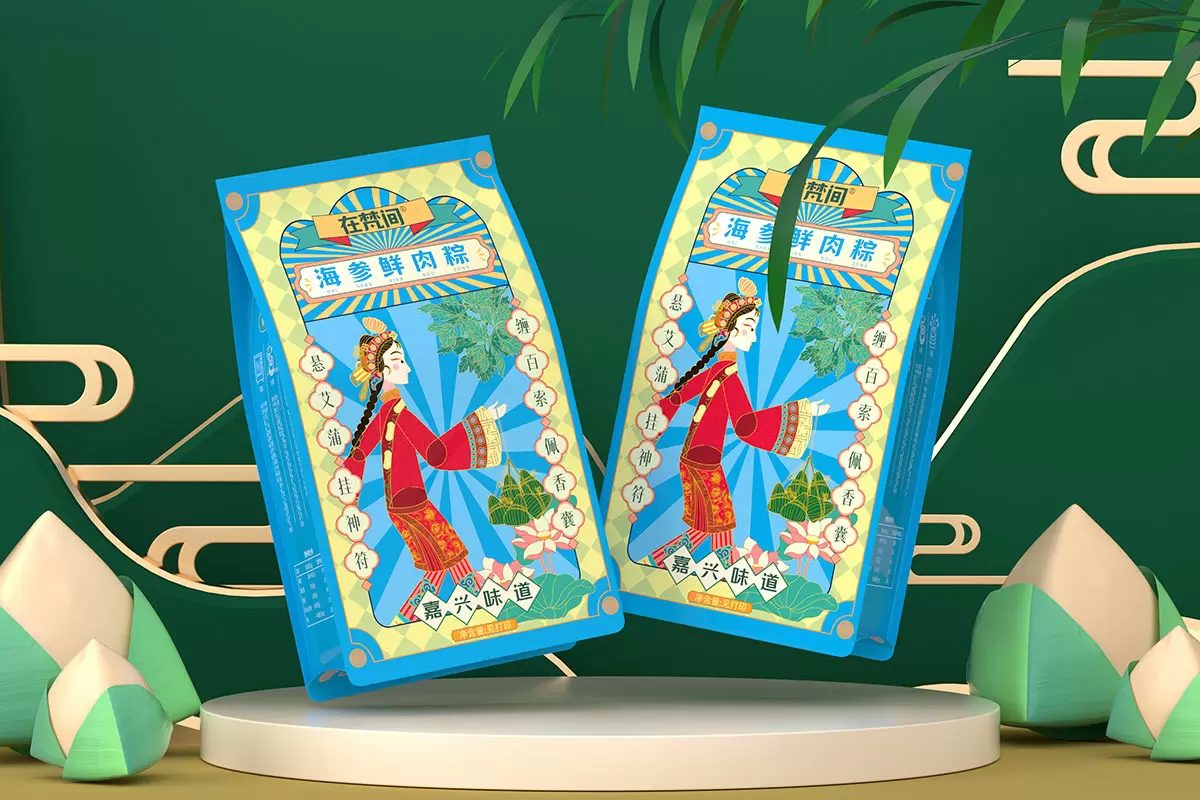 这款在梵间的粽子包装设计通过视觉设计表现嘉兴当地的端午粽子的特色风味。在包装设计中,一位身穿传统服饰的女子手提着一只粽子,形象栩栩如生地展现浓郁的中国传统文化特色。背景的艾蒲、竹叶、荷花等元素,呼应两侧关于端午时令的民间节日风俗。不同的色彩方案用于识别不同粽子风味和口感,为消费者提供更加直观的购买指引。整体包装设计简洁而大方,突出了产品的主题与特色,展示渊远的端午文化和嘉兴的当地特色。
