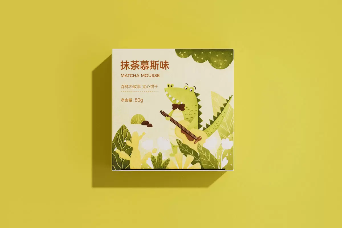 一个崭新的巧克力曲奇品牌--森林の故事,品牌将曲奇作为一根纽带,致力于给消费者带来美味、健康和高质的享受,传达温暖的问候和深切的关怀。围绕此基调,动物们欢聚一堂,开起了专属它们的森林游玩会,呼应品名森林の故事,在这里,你可以尽情释放天性,与森林里的动物们品尝美食、享受快乐!运用到包装上,动物们都有代表自己的口味饼干,暖色系的手绘插画,描绘了猴子、狮子、狐狸等的表演场景,画面轻松欢快,充满想象。