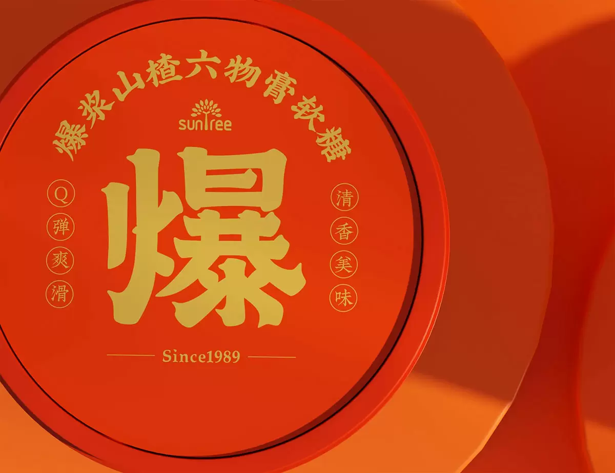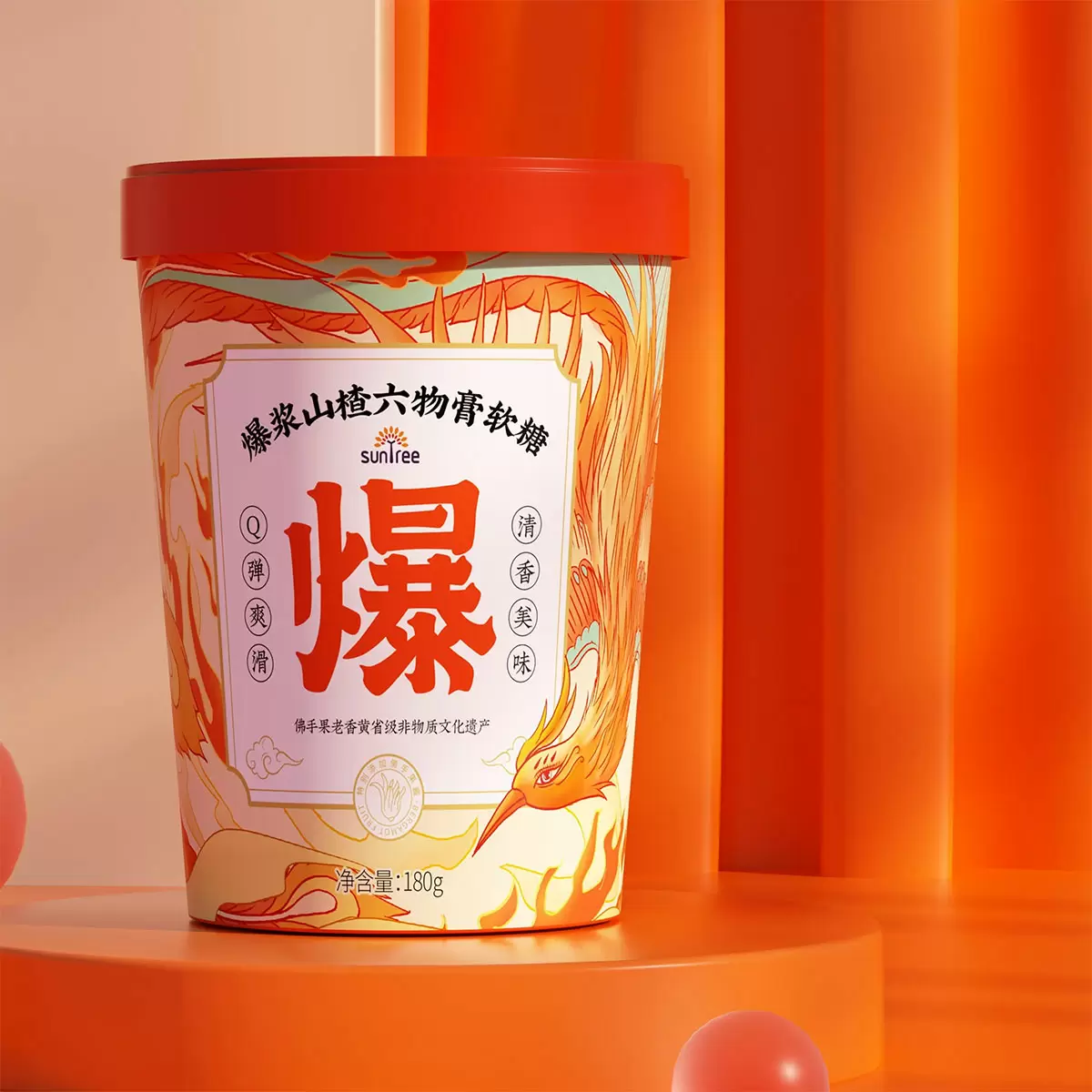 “爆浆软糖”的“爆浆”特点,提取关键字,用符号的形式呈现,增加包装冲击力。同时结合展翠食品集团本身特点,提取代表性符号“凤凰”与国潮风格结合,进行插画设计。
