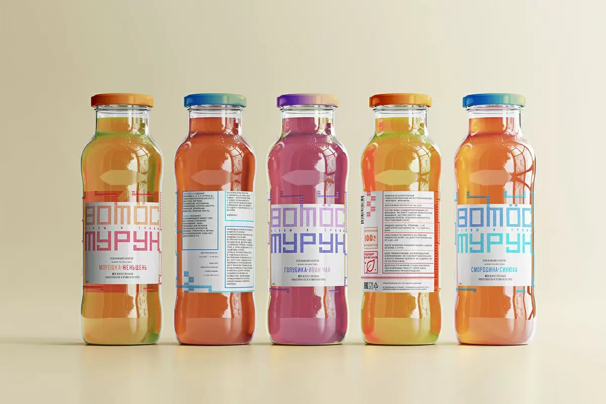 VOTOSTUUN公司(翻译为“草莓”)的饮料,该公司用科米共和国种植的浆果和草药生产饮料。这种风格基于“装饰/刺绣”的隐喻,因为科米人不仅以各种织物上美丽的图案而闻名,而且在装饰业务中也有自己的象征意义。此外,标志和包装细节的颜色取决于饮料中包含的成分(考虑了它们的调色板)。有两种类型的饮料:静止饮料和碳酸饮料。